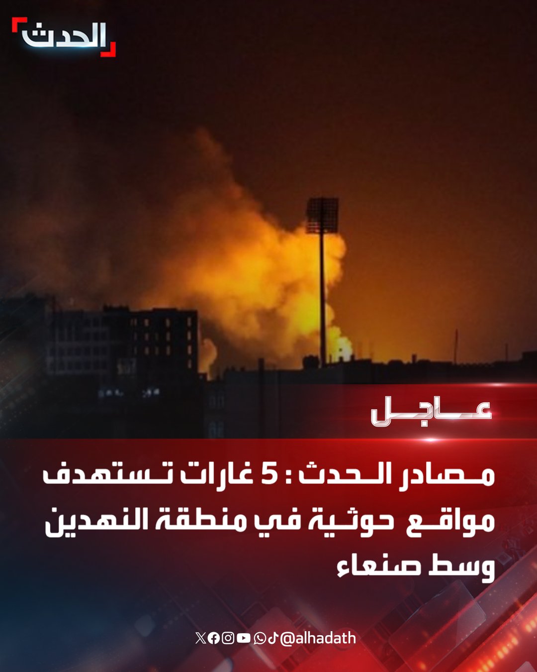 مصادر الحدث: 5 غارات تستهدف مواقع حوثية في منطقة النهدين وسط صنعاء. قصف مواقع حوثية في منطقة طخية بمحافظة صعدة. تحليق مستمر للطيران الأميركي فوق صنعاء وقصف مواقع حوثية في عدة جهات #الحدث_عاجل