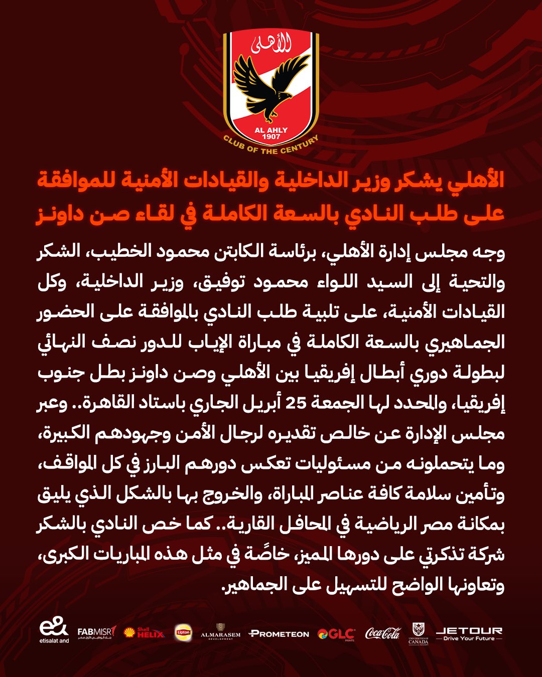 بعد موافقة السلطات الأمنية في مصر.. الأهلي المصري يواجه صن داونز وسط حضور جماهيري بالسعة الكاملة في إياب قبل نهائي #دوري_أبطال_أفريقيا