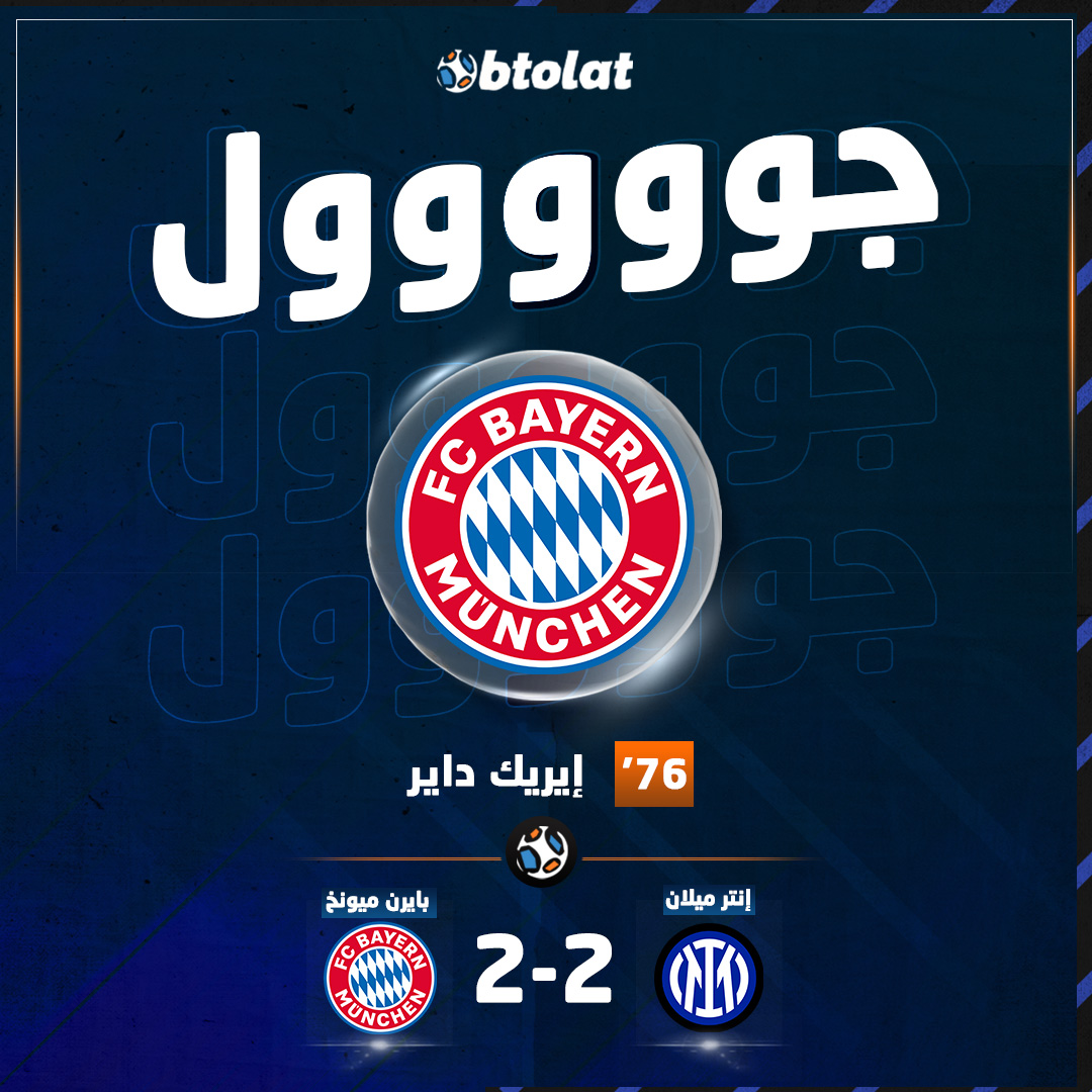 جوووووووووول! إيريك داير يسجل هدف التعادل ل بايرن ميونخ في شباك إنتر ميلان في د76 لتصبح النتيجة 2-2