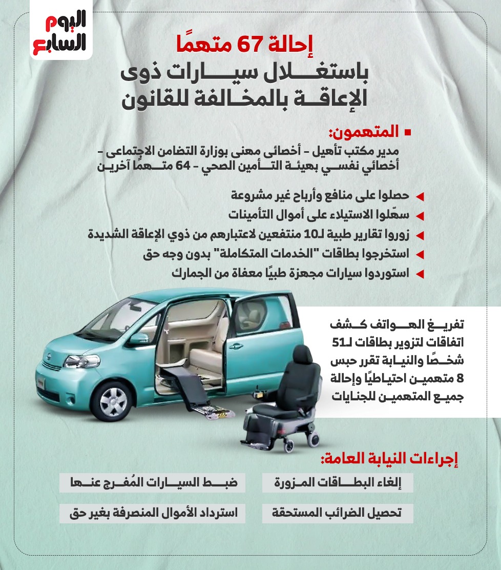 إحالة 67 متهمًا باستغلال سيارات ذوي الإعاقة بالمخالفة للقانون