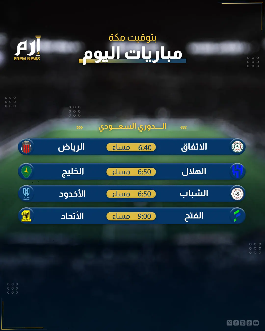 في المملكة العربية السعودية يستقبل الهلال فريق الخليج في الجولة الـ28 من دوري روشن، بينما الاتحاد المتصدر بـ65 نقطة يحل ضيفًا على الفتح.