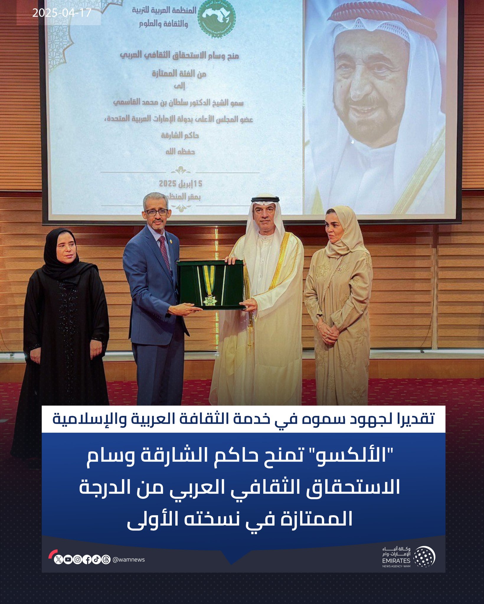 تونس في 17 أبريل/ وام/ مُنِحَ صاحب السمو الشيخ الدكتور سلطان بن محمد القاسمي عضو المجلس الأعلى حاكم الشارقة وسام الاستحقاق الثقافي العربي من الدرجة الممتازة، في نسخته الأولى، من قبل المنظمة العربية للتربية والثقافة والعلوم الألكسو .