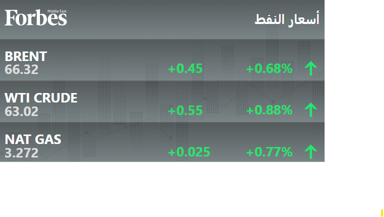 وصعد خام برنت 0.49% بمقدار 0.32 دولار ليستقر عند 66.17 دولار للبرميل، فيما ارتفع خام غرب تكساس الوسيط الأميركي 0.62% أو 0.45 دولار ليصل إلى 62.90 دولار للبرميل.
