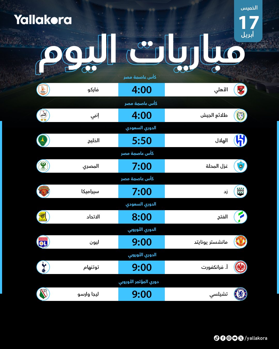 ختام دور مجموعات كأس عاصمة مصر. مانشستر يونايتد يتحدى ليون لحسم بطاقة نصف نهائى الدوري الأوروبي. تشيلسي في مهمة سهلة أمام ليجا وارسو بدوري المؤتمر الأوروبي. جدول مباريات اليوم