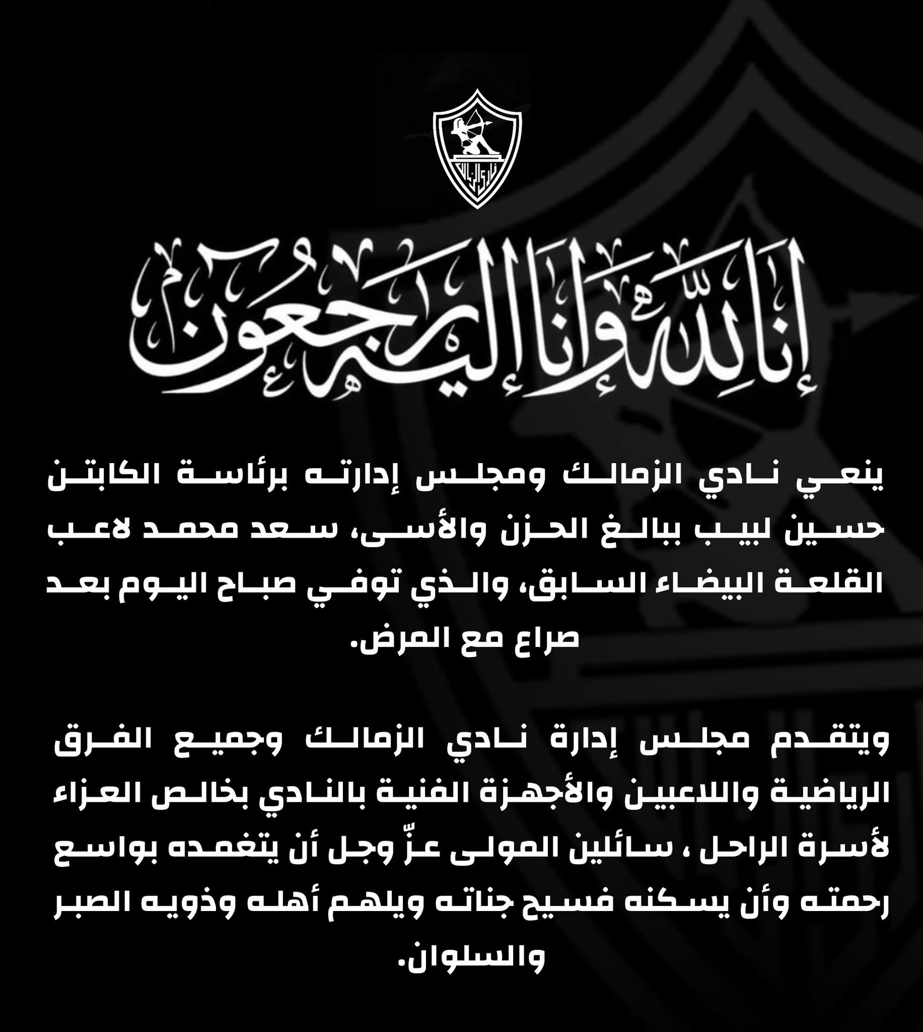 نادي الزمالك ينعي لاعبه السابق سعد محمد بعد صراع مع المرض