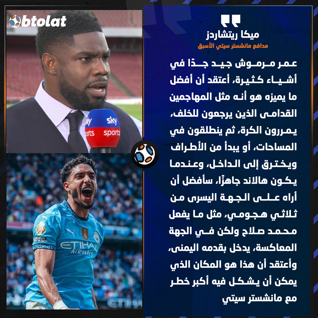 ريتشاردز: عمر مرموش جيد جدًا في أشياء كثيرة، أعتقد أن أفضل ما يميزه هو أنه مثل المهاجمين القدامى الذين يرجعون للخلف، يمررون الكرة، ثم ينطلقون في المساحات، أو يبدأ من الأطراف ويخترق إلى الداخل، وعندما يكون هالاند جاهزًا، سأفضل أن أراه على الجهة اليسرى من ثلاثي هجومي، وأعتقد أن هذا هو المكان الذي يمكن أن يشكل فيه أكبر خطر مع مانشستر سيتي