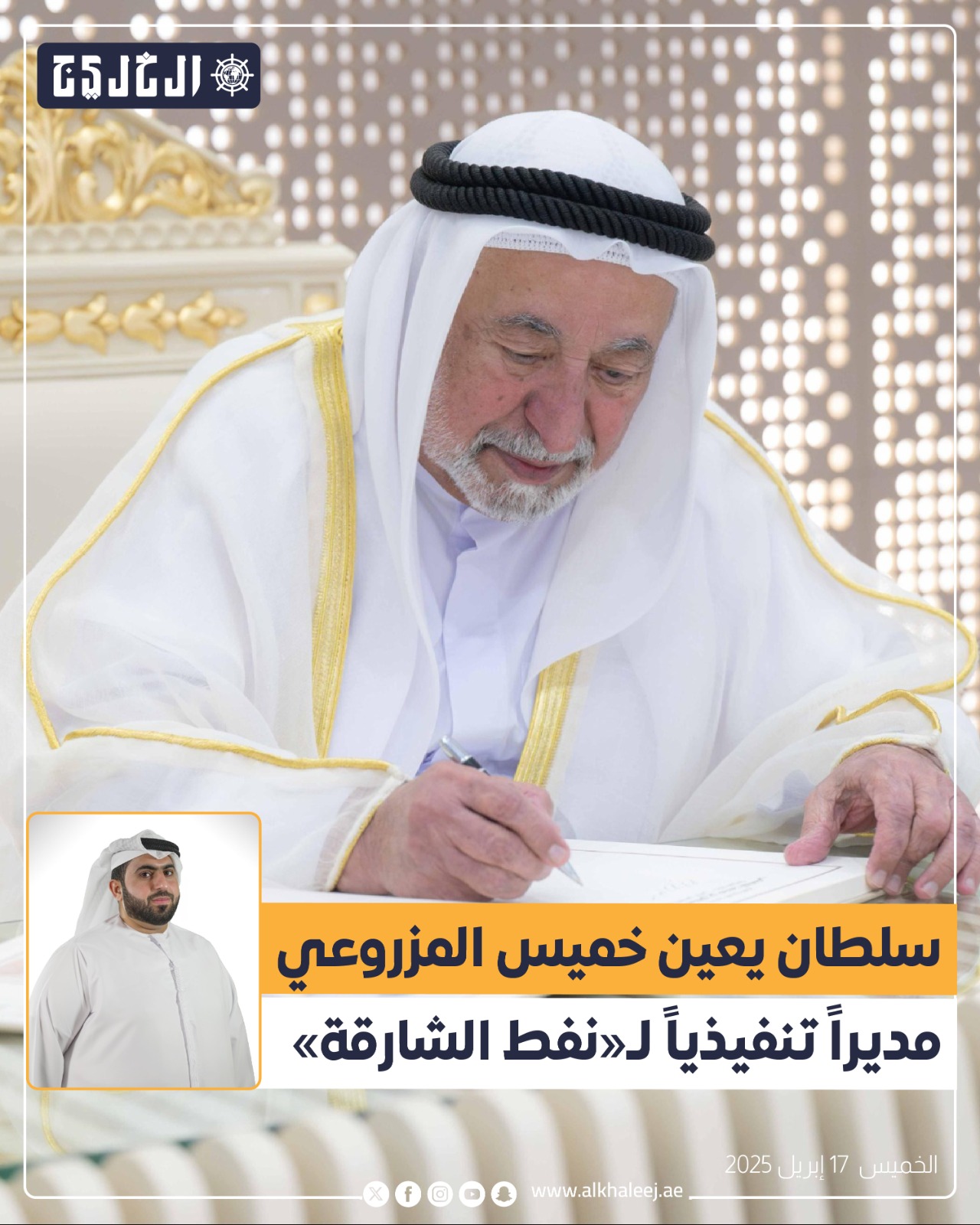 أصدر صاحب السموّ الشيخ الدكتور سلطان بن محمد القاسمي، عضو المجلس الأعلى حاكم الشارقة، مرسوماً أميرياً بتعيين خميس عبدالله المزروعي مديراً تنفيذياً لمؤسسة نفط الشارقة الوطنية (SNOC).