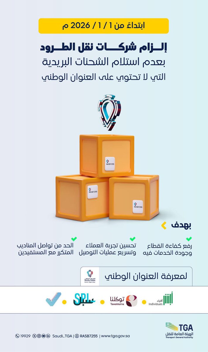 أعلنت الهيئة العامة للنقل، أنه ابتداءً من 1 يناير 2026م، سيتم إلزام شركات نقل الطرود بعدم تسلُّم أيّ شحناتٍ بريدية لا تتضمن العنوان الوطني، وذلك ضمن جهود تحسين كفاءة القطاع، وتجويد الخدمات اللوجستية.