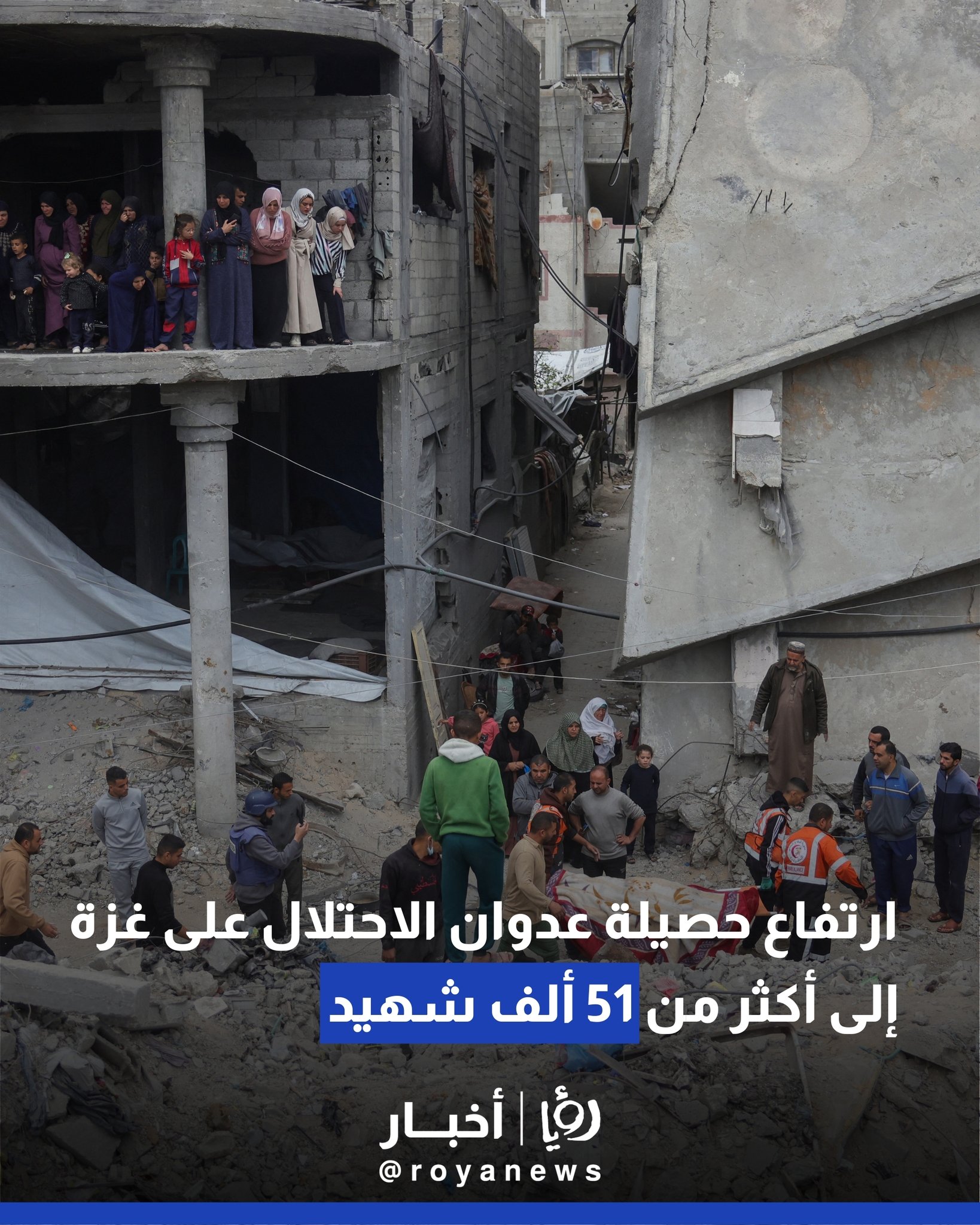 وأوضحت الوزارة في بيانها، اليوم، أن الحصيلة الإجمالية لضحايا عدوان الاحتلال الإسرائيلي منذ 7 تشرين الأول 2023، ارتفعت إلى 51,065 شهيدًا و116,505 مصابين.