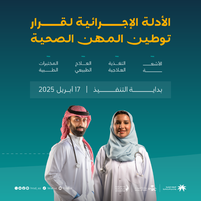 أعلنت وزارة الموارد البشرية والتنمية الاجتماعية، بالشراكة مع وزارة الصحة، بدء تطبيق المرحلة الأولى من قرار رفع نسب التوطين لأربع مهن صحية في القطاع الخاص، وذلك اعتباراً من يوم الخميس 18 شعبان 1446هـ؛ الموافق 17 أبريل 2025م، وفقاً للتعريفات والمسميات المهنية المعتمدة.
