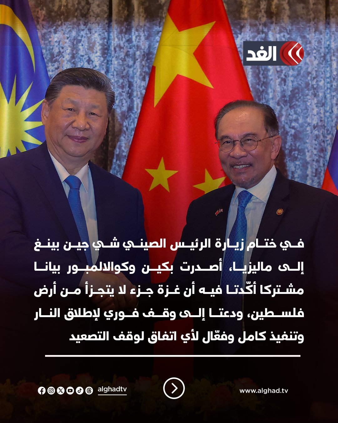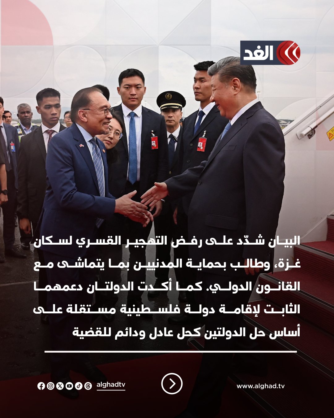 في موقف مشترك ل بكين و كوالالمبور أعلنتا رفضهما تهجير فلسطينيي غزة، والعدوان على القطاع، وطالبا بدولة فلسطينية مستقلة حتى يتوقف الصراع بالمنطقة