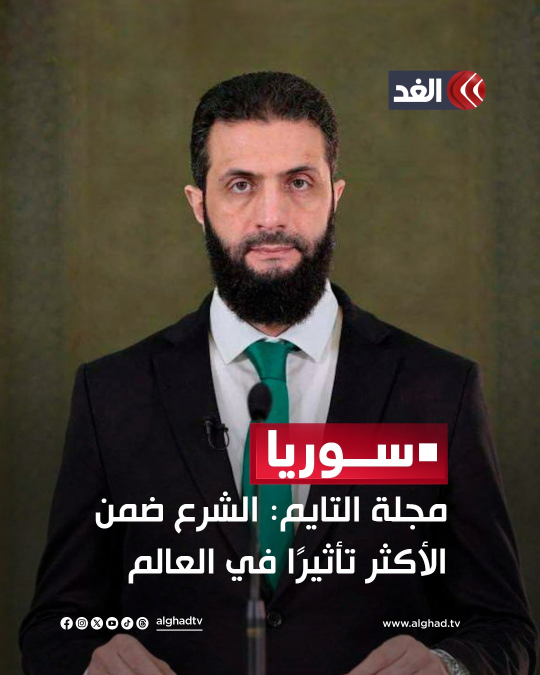 اختارت مجلة «تايم» الأميركية الرئيس السوري الانتقالي أحمد الشرع ضمن قائمتها لأكثر 100 شخصية تأثيرًا في العالم لعام 2025، ووُصف الشرع بأنه شخصية محورية في التحولات السياسية الأخيرة في البلاد.