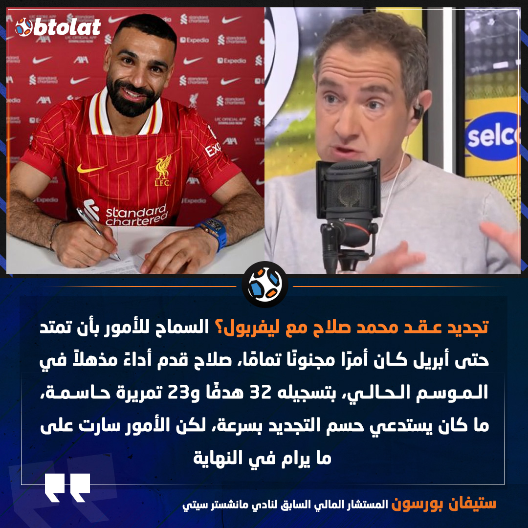 ستيفان بورسون: تجديد عقد محمد صلاح؟ السماح للأمور بأن تمتد حتى أبريل كان أمرًا مجنونًا تمامًا، صلاح قدم أداءً مذهلاً في الموسم الحالي، بتسجيله 32 هدفًا و23 تمريرة حاسمة، ما كان يستدعي حسم التجديد بسرعة