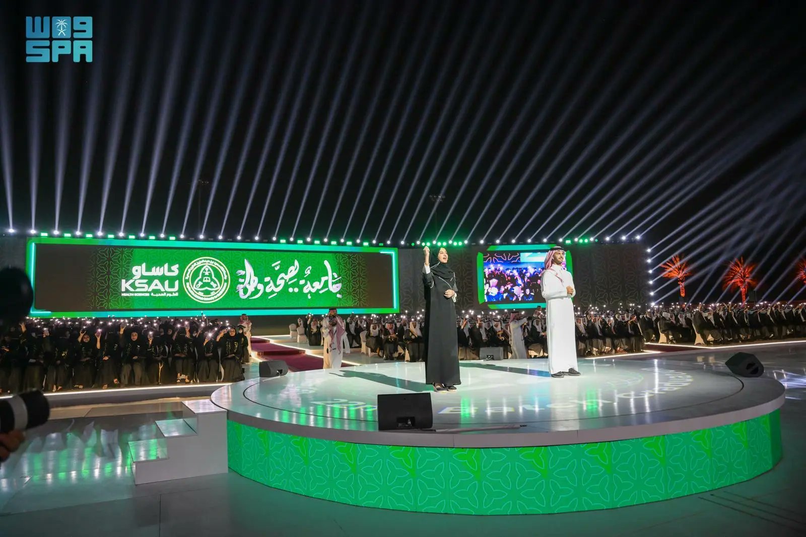 وبعد السلام الملكي، ابتدأ الحفل بآيات من القرآن الكريم، ثم انطلقت مسيرة الخريجين في المدن الجامعية الثلاث: الرياض، وجدة، والأحساء، والبالغ عددهم 2149 طالبًا وطالبة من مختلف كليات الجامعة وفي مختلف التخصصات الطبية.