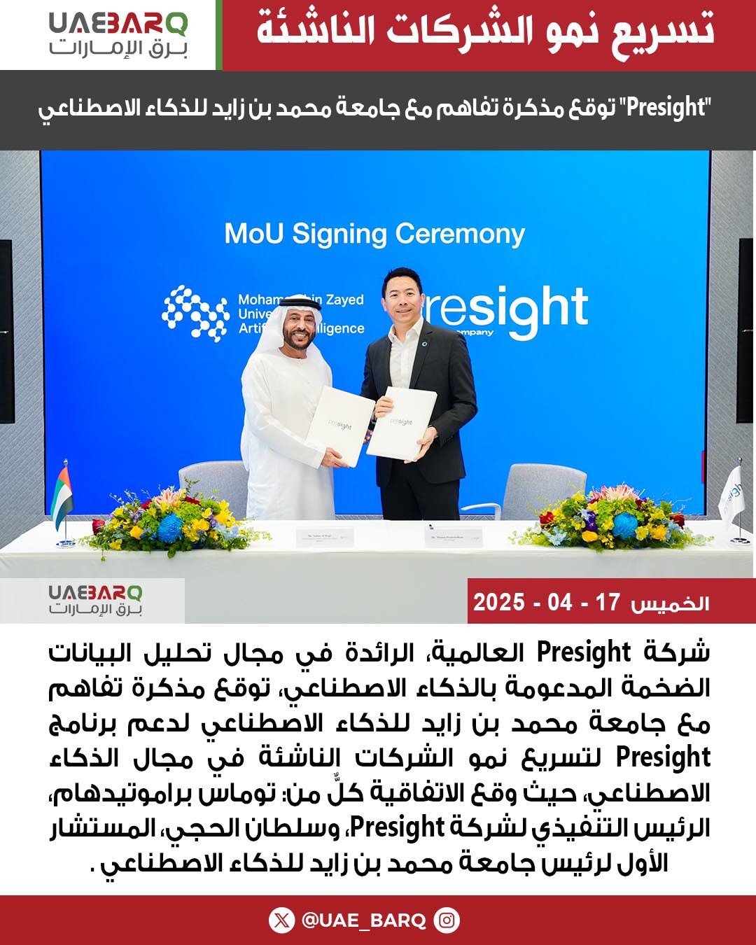 شركة Presight العالمية، الرائدة في مجال تحليل البيانات الضخمة المدعومة بالذكاء الاصطناعي، توقع مذكرة تفاهم مع جامعة محمد بن زايد للذكاء الاصطناعي لدعم برنامج Presight لتسريع نمو الشركات الناشئة في مجال الذكاء الاصطناعي، حيث وقع الاتفاقية كلٌّ من: توماس براموتيدهام، الرئيس التنفيذي لشركة Presight، وسلطان الحجي، المستشار الأول لرئيس جامعة محمد بن زايد للذكاء الاصطناعي. برق الإمارات PresightAI