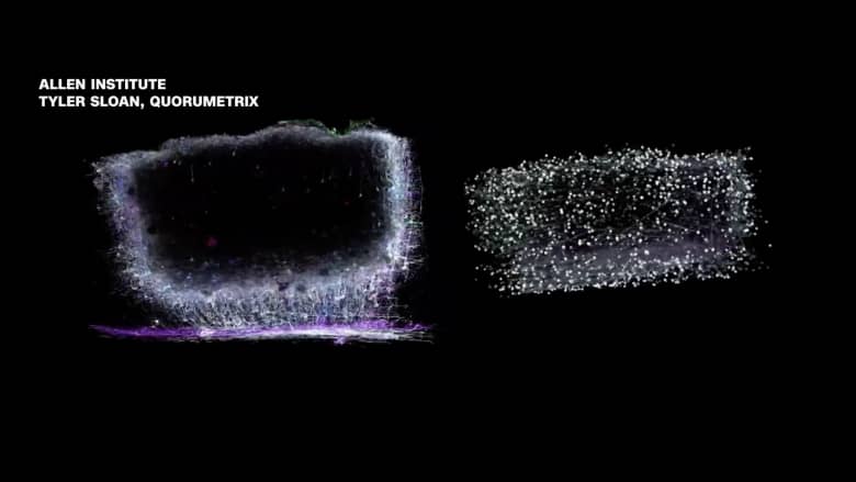 00:13 رسم متحرك يُظهر جميع الخلايا بالقشرة البصرية في دماغ الفأر بعد إنهاء حياة الفأر بطريقة رحيمة، أخذ الباحثون من معهد آلن المليمتر المكعب ذاته من الدماغ وقطّعوه إلى أكثر من 28,000 طبقة، يبلغ سُمك كل واحدة منها 1/400 من عرض شعرة الإنسان، ثم التقطوا صورًا لكل شريحة على حدة. بعد ذلك، قاموا بإعادة تركيب الصور في صورة مركبة واحدة.