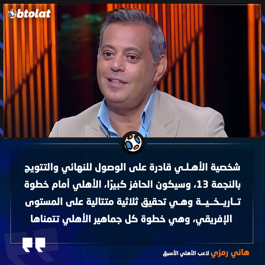 هاني رمزي: شخصية الأهلي قادرة على الوصول للنهائي والتتويج بالنجمة 13، وسيكون الحافز كبيرًا، الأهلي أمام خطوة تاريخية وهي تحقيق ثلاثية متتالية على المستوى الإفريقي، وهي خطوة كل جماهير الأهلي تتمناها