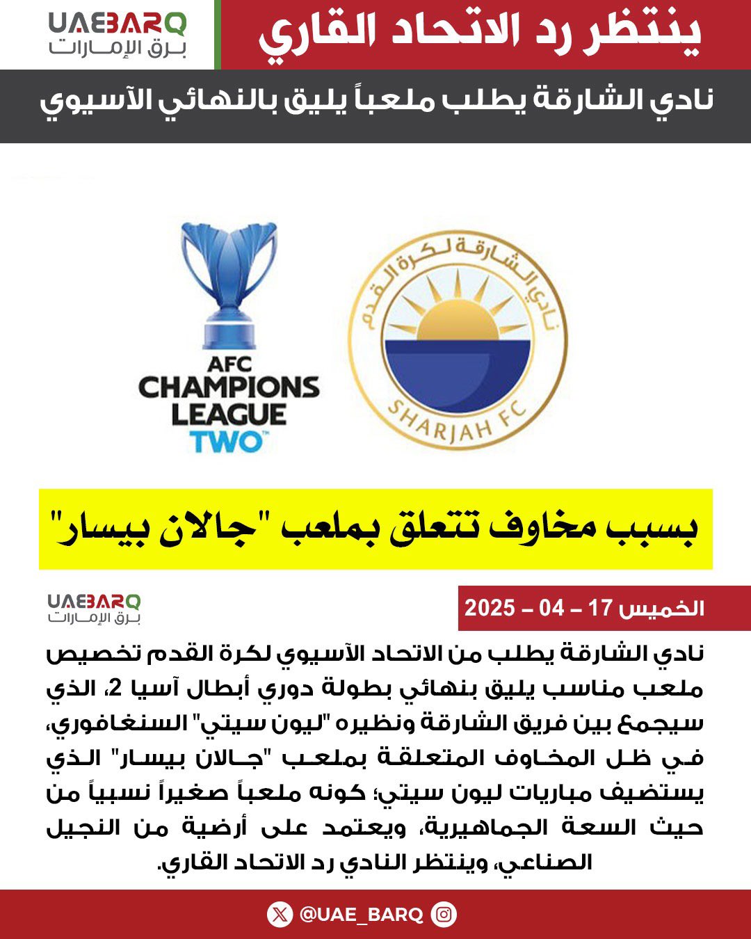 ينتظر رد الاتحاد القاري.. نادي الشارقة يطلب ملعباً يليق ب #النهائي_الآسيوي.