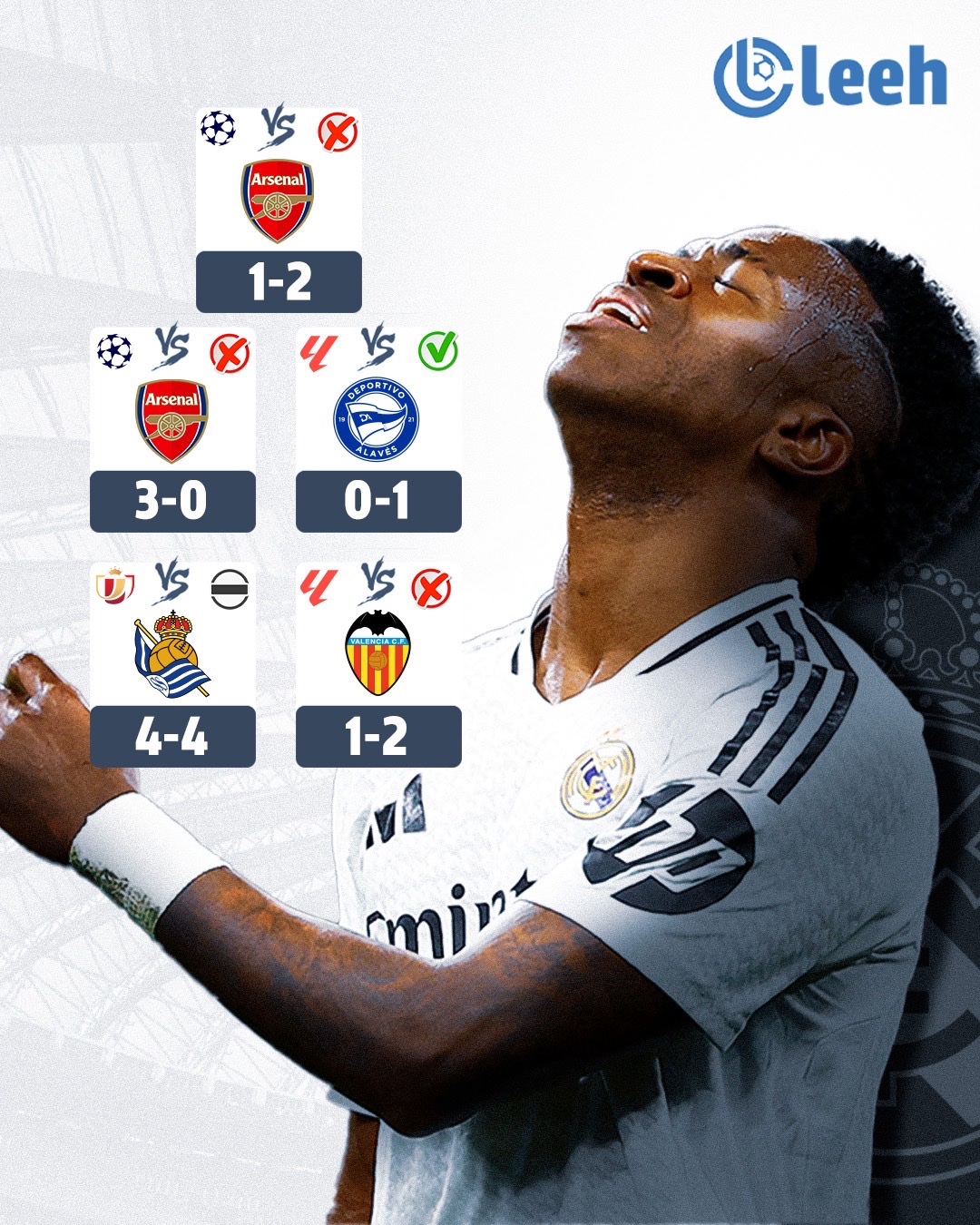 تعادل مع ريال سوسيداد 4-4. هزيمة ضد فالنسيا 2-1. هزيمة ضد أرسنال 3-0. فوز ضد ألافيس 1-0. هزيمة ضد أرسنال 2-1. ريال مدريد حقق فوز وحيد في آخر 5 مباريات وتلقت شباكه 11 هدفًا.. ماذا يحدث لأبطال أوروبا هذا الموسم