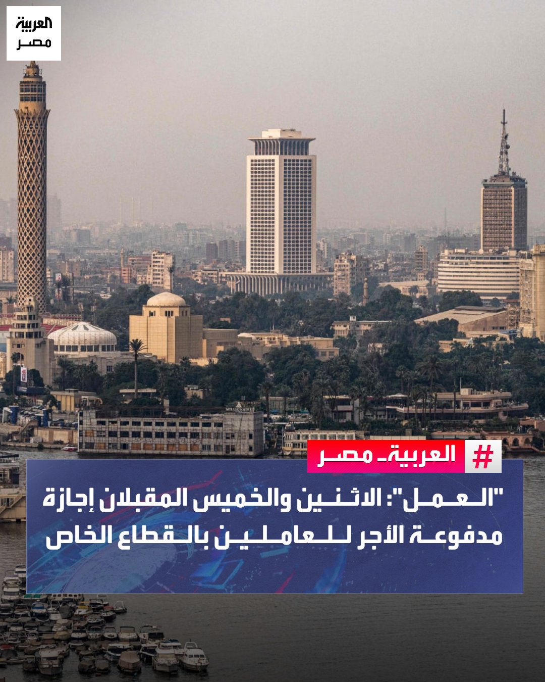 أعلن وزير العمل محمد جبران، أن يوم الاثنين الموافق 21 إبريل الجاري، إجازة رسمية مدفوعة الأجر بمناسبة عيد شم النسيم، وكذلك يوم الخميس الموافق 24 إبريل 2025 بدلًا عن يوم الجمعة الموافق 25 إبريل بمناسبة عيد تحرير سيناء، وذلك للعاملين بالقطاع الخاص المخاطبين بأحكام قانون العمل، بحسب بيان. _مصر