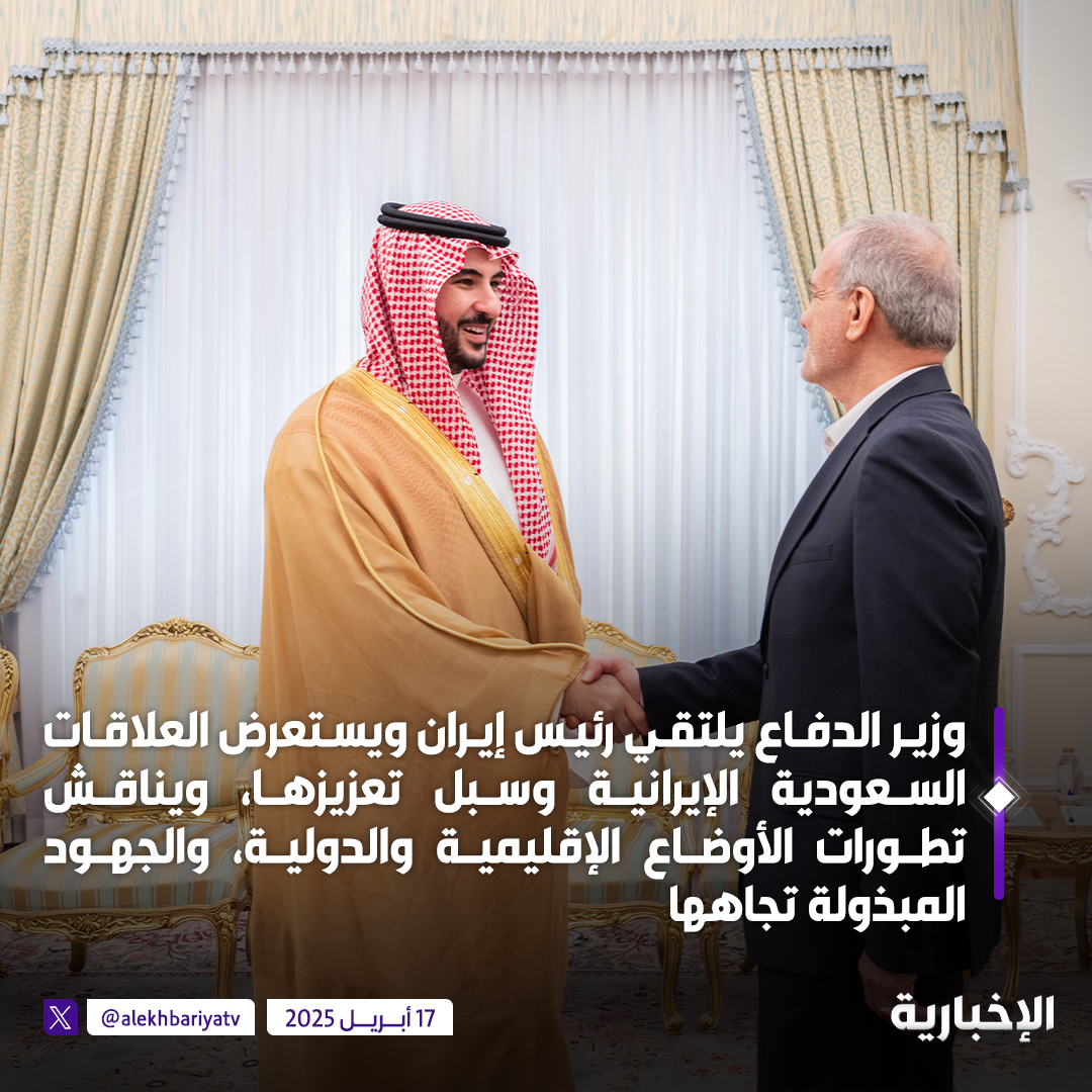 بتوجيه من القيادة ... وزير الدفاع يلتقي رئيس إيران ويستعرض العلاقات السعودية الإيرانية وسبل تعزيزها، ويناقش تطورات الأوضاع الإقليمية والدولية، والجهود المبذولة تجاهها #الإخبارية
