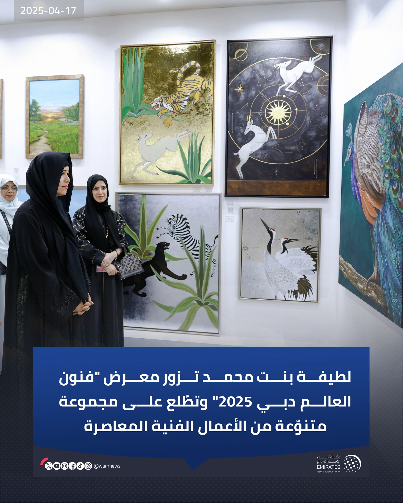دبي في 17 أبريل /وام/ زارت سموّ الشيخة لطيفة بنت محمد بن راشد آل مكتوم، رئيسة هيئة الثقافة والفنون في دبي، معرض "فنون العالم دبي 2025"، الحدث الرائد على مستوى منطقة الشرق الأوسط الذي يتيح الفرصة لعشاق الفنون لامتلاك إبداعات فنية بتكلفة مقبولة، ما يسهم في التشجيع على اقتناء الأعمال الفنية ونشر ثقافة التذوق الفني، وتحفيز المواهب الفنية الواعدة وإتاحة المجال أمامها للظهور والانتشار.