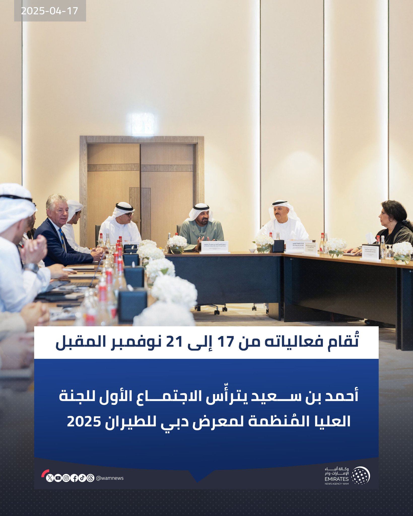 دبي في 17 أبريل/وام/ ترأّس سموّ الشيخ أحمد بن سعيد آل مكتوم، رئيس هيئة دبي للطيران المدني رئيس مطارات دبي الرئيس الأعلى الرئيس التنفيذي لطيران الإمارات والمجموعة، رئيس اللجنة العليا المنظّمة لمعرض دبي للطيران، الاجتماع الأول للجنة العليا المنظّمة لمعرض دبي للطيران 2025، وذلك لاستعراض الاستعدادات والتحضيرات الجارية لانطلاق فعاليات الدورة الـ19 من المعرض، المُقرّر تنظيمه خلال الفترة من 17 إلى 21 نوفمبر 2025.