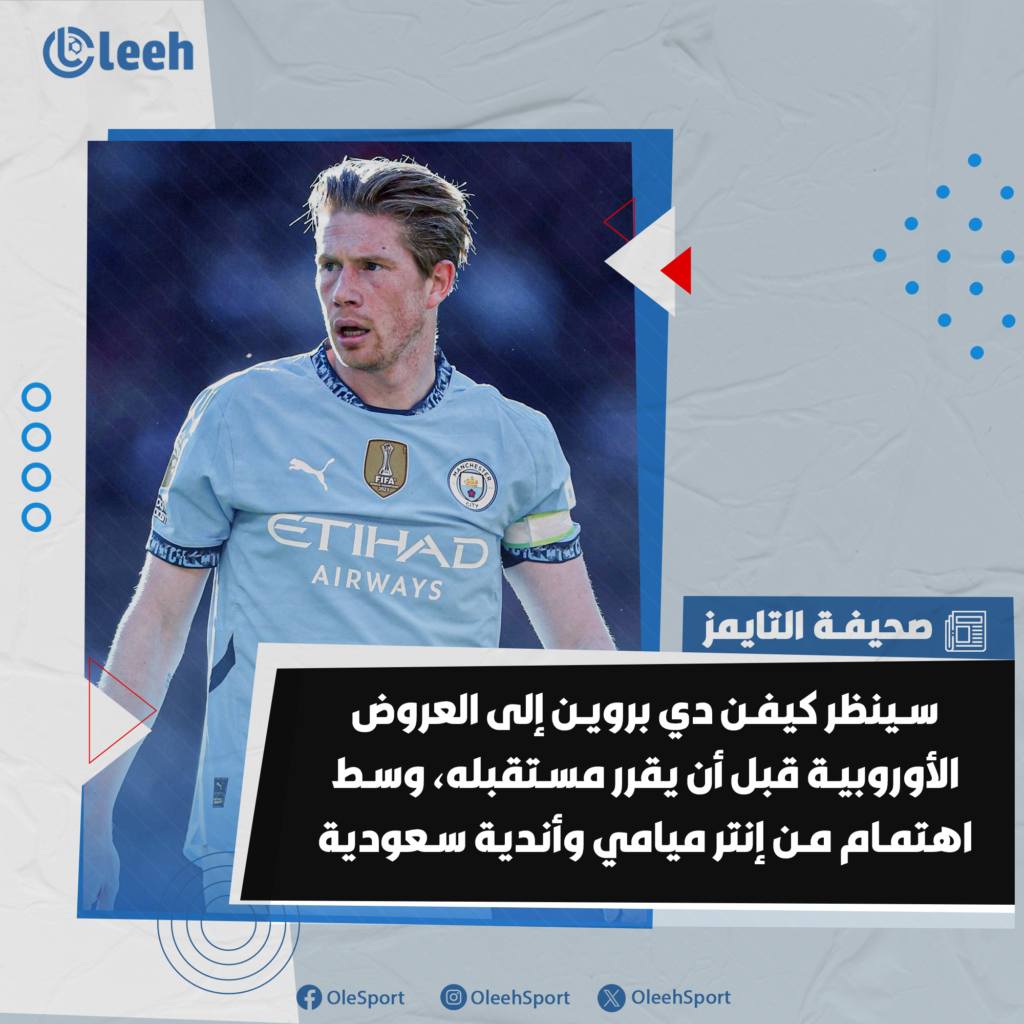 كيفين دي بروين يفضل الاستمرار في الملاعب الأوروبية على الانتقال إلى السعودية أو إنتر ميامي الأمريكي.. دي بروين سينظر في العروض المقدمة له من الأندية الأوروبية قبل اتخاذ قراره لحسم مستقبله بعد إعلان رحيله عن مانشستر سيتي نهاية الموسم
