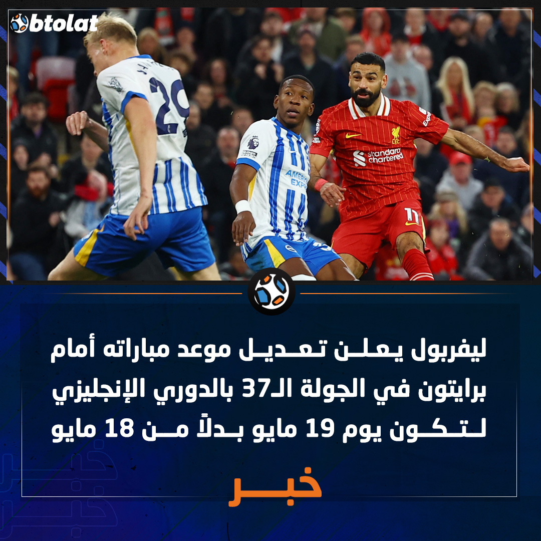 ليفربول يعلن تعديل موعد مباراته أمام برايتون في الجولة ال37 بالدوري الإنجليزي لتكون يوم 19 مايو بدلًا من 18 مايو