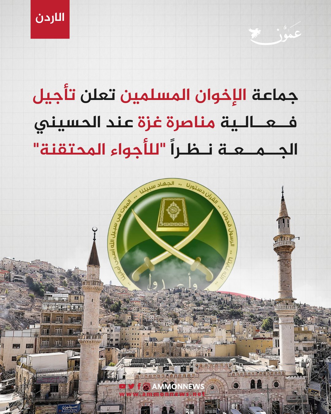 جماعة الإخوان المسلمين تعلن تأجيل فعالية مناصرة غزة عند الحسيني الجمعة نظراً "للأجواء المحتقنة" #عمون