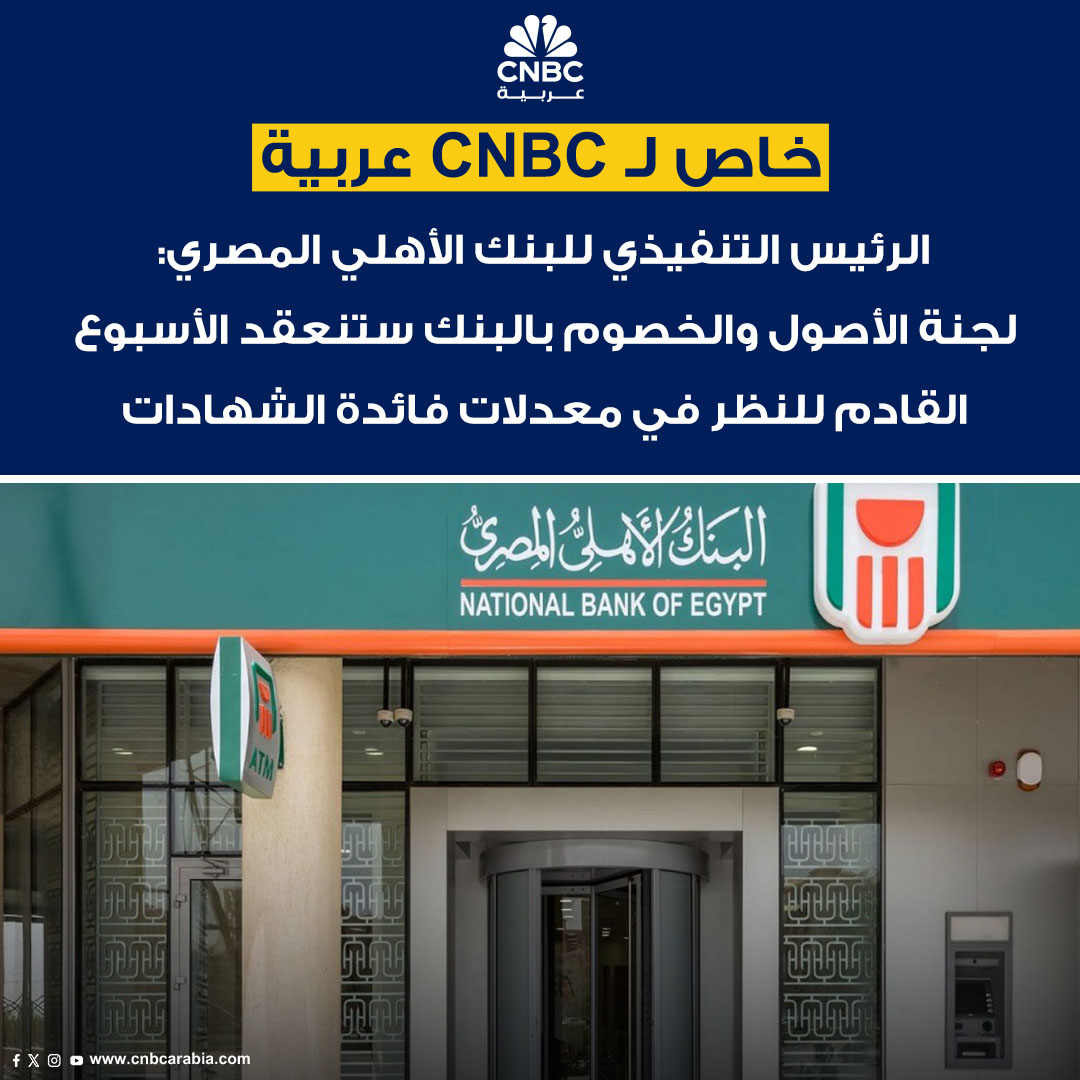 الرئيس التنفيذي للبنك الأهلي المصري ل CNBC عربية: لجنة الأصول والخصوم بالبنك ستنعقد الأسبوع القادم للنظر في معدلات فائدة الشهادات. اجتماع اللجنة يأتي بعد تخفيض لجنة السياسات النقدية للبنك المركزي المصري في اجتماعها اليوم لمعدلات الإيداع والإقراض بواقع 225 نقطة أساس