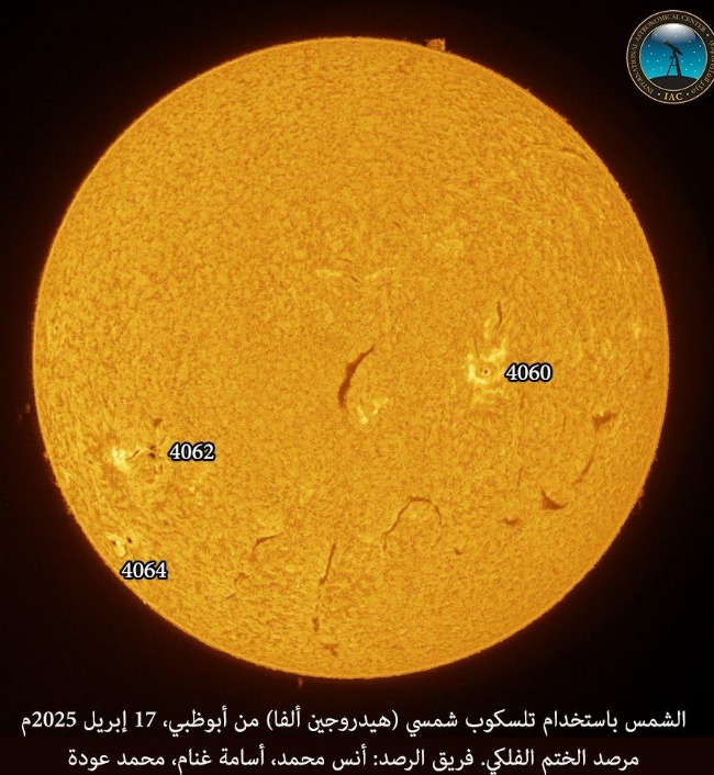 عمون - نشر مرصد الفلك الدولي، تزامنا مع العاصفة المغناطيسية التي شهدتها الأرض صباح اليوم الخميس نتيجة لوصول انبعاثات شمسية، صورة للشمس تم التقاطها اليوم من مرصد الختم الفلكي في أبوظبي، وذلك باستخدام تلسكوب شمسي (هيدروجين ألفا).