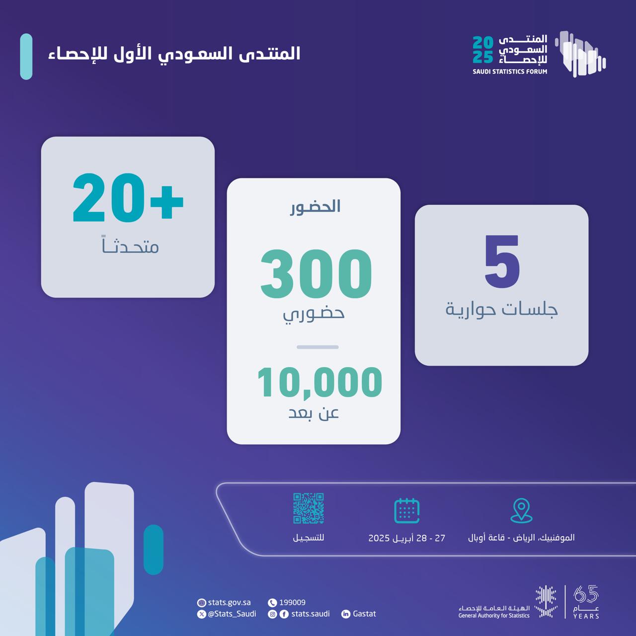 تنظم الهيئة العامة للإحصاء المنتدى السعودي الأول للإحصاء تحت شعار إحصـاءات لفـرص مستدامـة خلال الفترة من 27 إلى 28 إبريل 2025م في مدينة الرياض، بمشاركة عدد من أصحاب السمو والمعالي الوزراء ورؤساء وممثلي المنظمات الدولية والمكاتب الإحصائية لعدد من الدول والخبراء المحليين والدوليين وبحضور أكثر من 300 شخص من المهتمين بالعمل الإحصائي.