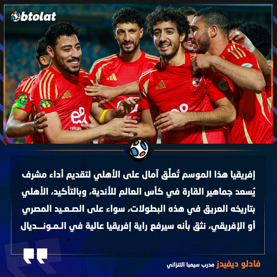 فادلو ديفيدز. إفريقيا هذا الموسم تُعلَّق آمال على الأهلي لتقديم أداء مشرف يُسعد جماهير القارة في كأس العالم للأندية، وبالتأكيد، الأهلي بتاريخه العريق سيرفع راية إفريقيا عالية في المونديال