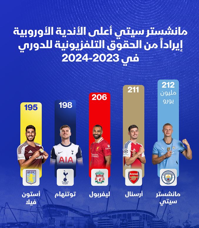 ب 212 مليون يورو.. نادي مانشستر سيتي هو أعلى الأندية الأوروبية تحقيقاً للإيرادات التلفزيونية من بطولة الدوري المحلي في الموسم الماضي، والأندية الخمسة التي تتصدر القائمة إنجليزية.