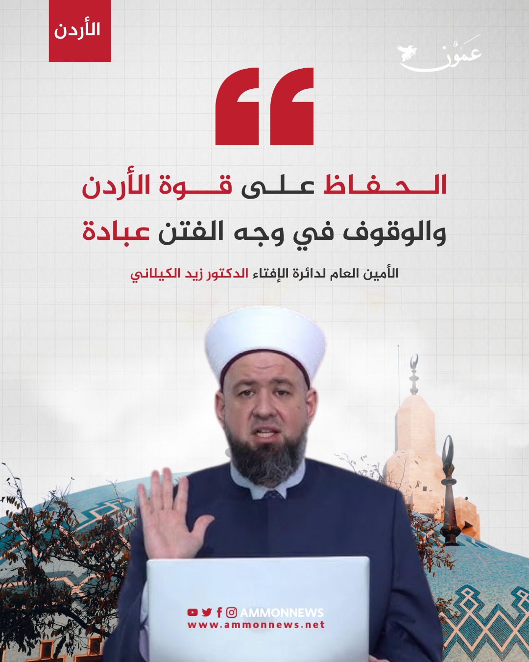 عمون - رصد - قال الأمين العام لدائرة الإفتاء، الدكتور زيد الكيلاني، إن المحافظة على أمن الأردن، والوقوف صفًّا واحدًا أمام أيّ فتنة، هو عبادة وعقيدة.