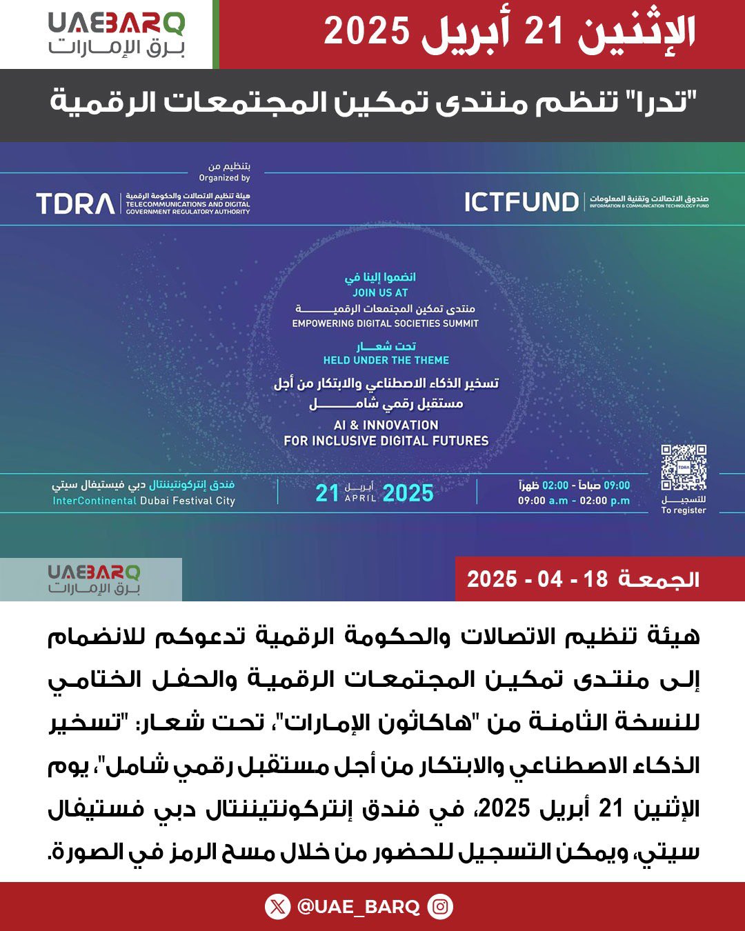 هيئة تنظيم الاتصالات والحكومة الرقمية تدعوكم للانضمام إلى منتدى تمكين المجتمعات الرقمية والحفل الختامي للنسخة الثامنة من "هاكاثون الإمارات"، تحت شعار: "تسخير الذكاء الاصطناعي والابتكار من أجل مستقبل رقمي شامل"، يوم الإثنين 21 أبريل 2025، في فندق إنتركونتيننتال دبي فستيفال سيتي، ويمكن التسجيل للحضور من خلال مسح الرمز في الصورة.. tdrauae