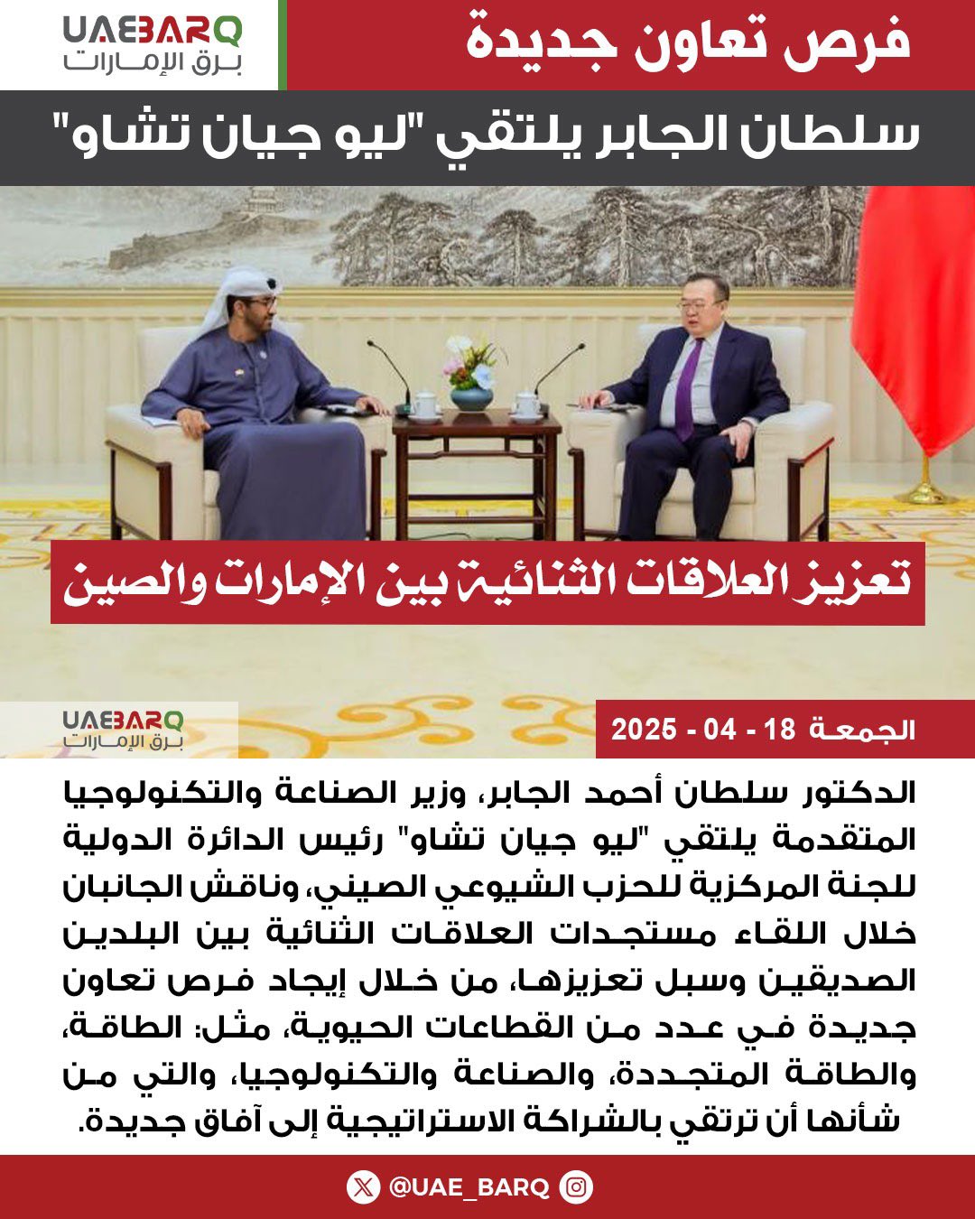 الدكتور سلطان أحمد الجابر، وزير الصناعة والتكنولوجيا المتقدمة يلتقي "ليو جيان تشاو" رئيس الدائرة الدولية للجنة المركزية للحزب الشيوعي الصيني، وناقش الجانبان خلال اللقاء مستجدات العلاقات الثنائية بين البلدين الصديقين وسبل تعزيزها، من خلال إيجاد فرص تعاون جديدة في عدد من القطاعات الحيوية، مثل: الطاقة، والطاقة المتجددة، والصناعة والتكنولوجيا، والتي من شأنها أن ترتقي بالشراكة الاستراتيجية إلى آفاق جديدة.