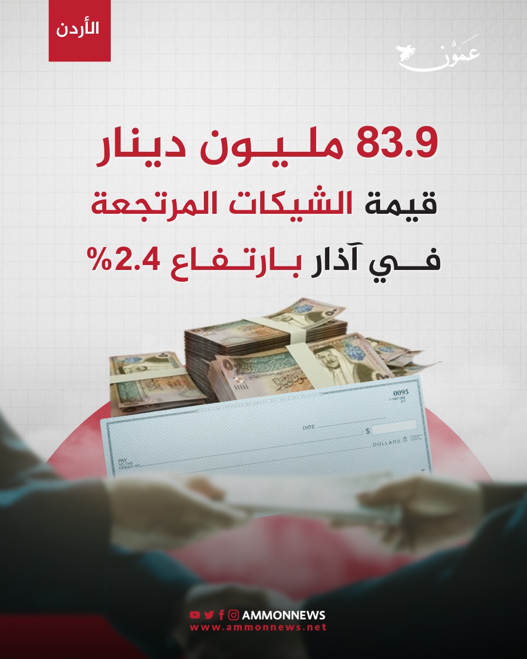 عمون - ارتفعت قيمة الشيكات المرتجعة خلال شهر آذار الماضي إلى 83.9 مليون دينار، مقارنة بـ 82 مليون دينار خلال شهر شباط الماضي، وبنسبة ارتفاع بلغت 2.4%.