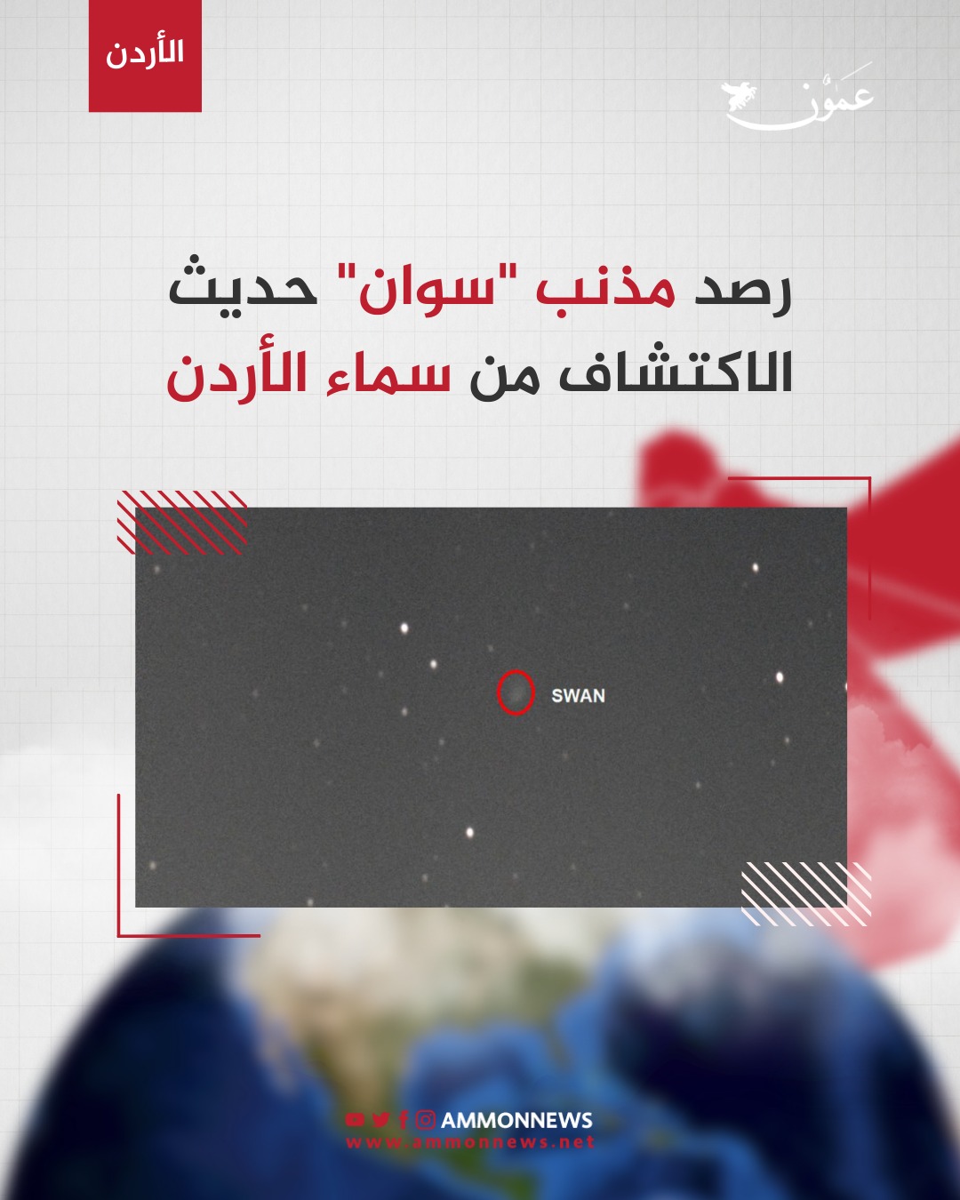 عمون - رصدت الجمعية الفلكية الأردنية، مذنب "سوان" المكتشف حديثاً، والاسم العلمي له C/2025 F2 SWAN، فجر الجمعة من جبال المفرق شمال شرق الأردن، في أول رصد له من سماء المملكة.