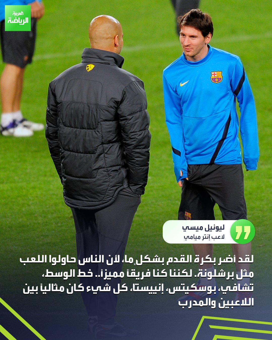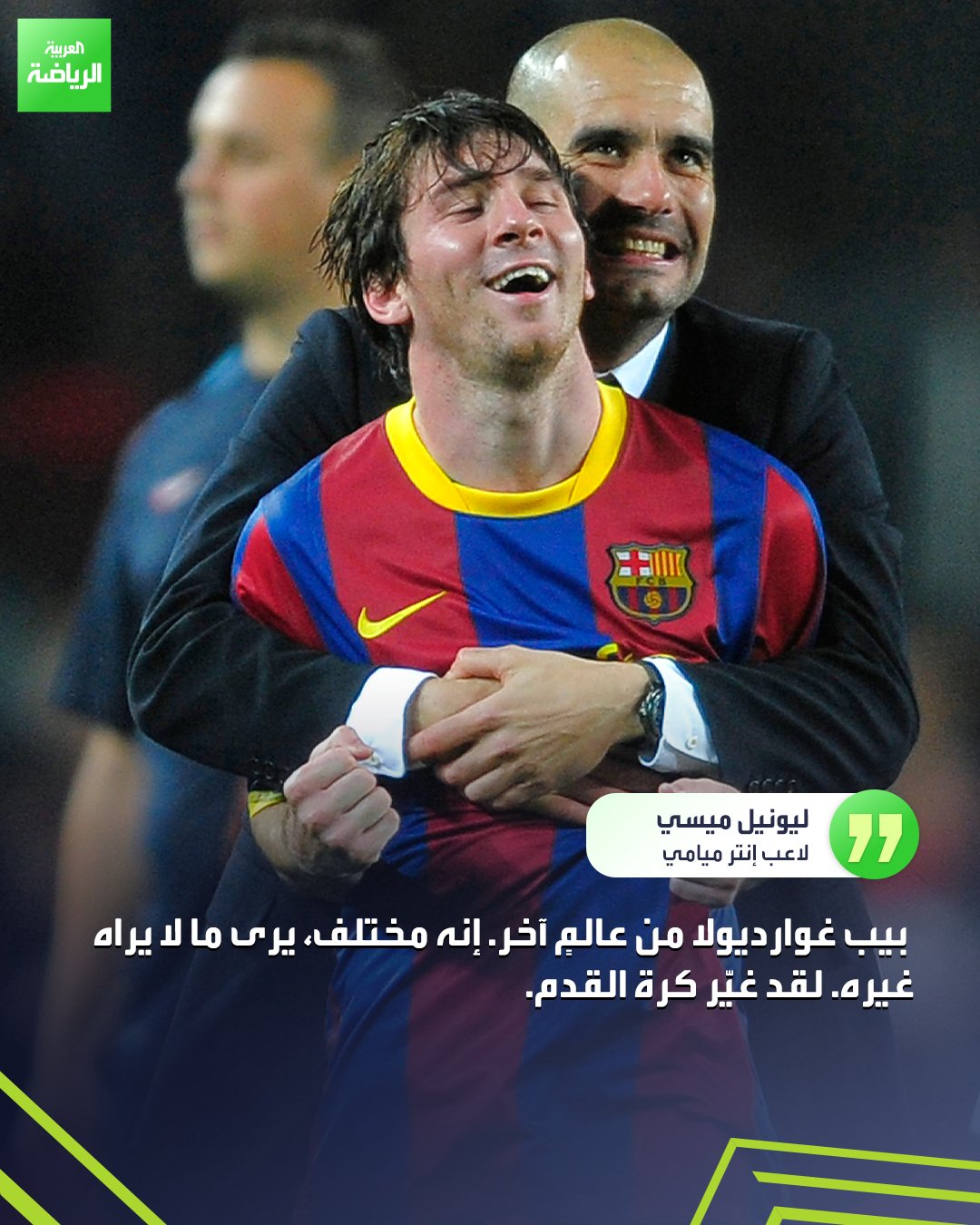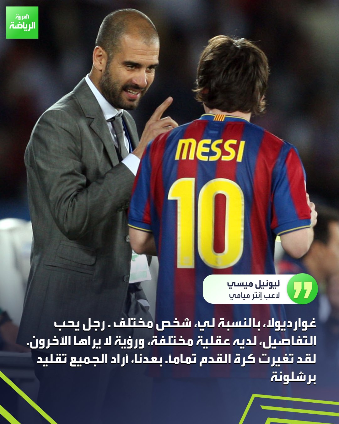 ليونيل ميسي يتحدث عن بيب غوارديولا في تصريحات عبر قناة "Simplemente Fútbol" : "لديه عقلية مختلفة وأراد الجميع تقليد ما فعله مع برشلونة". _رياضة