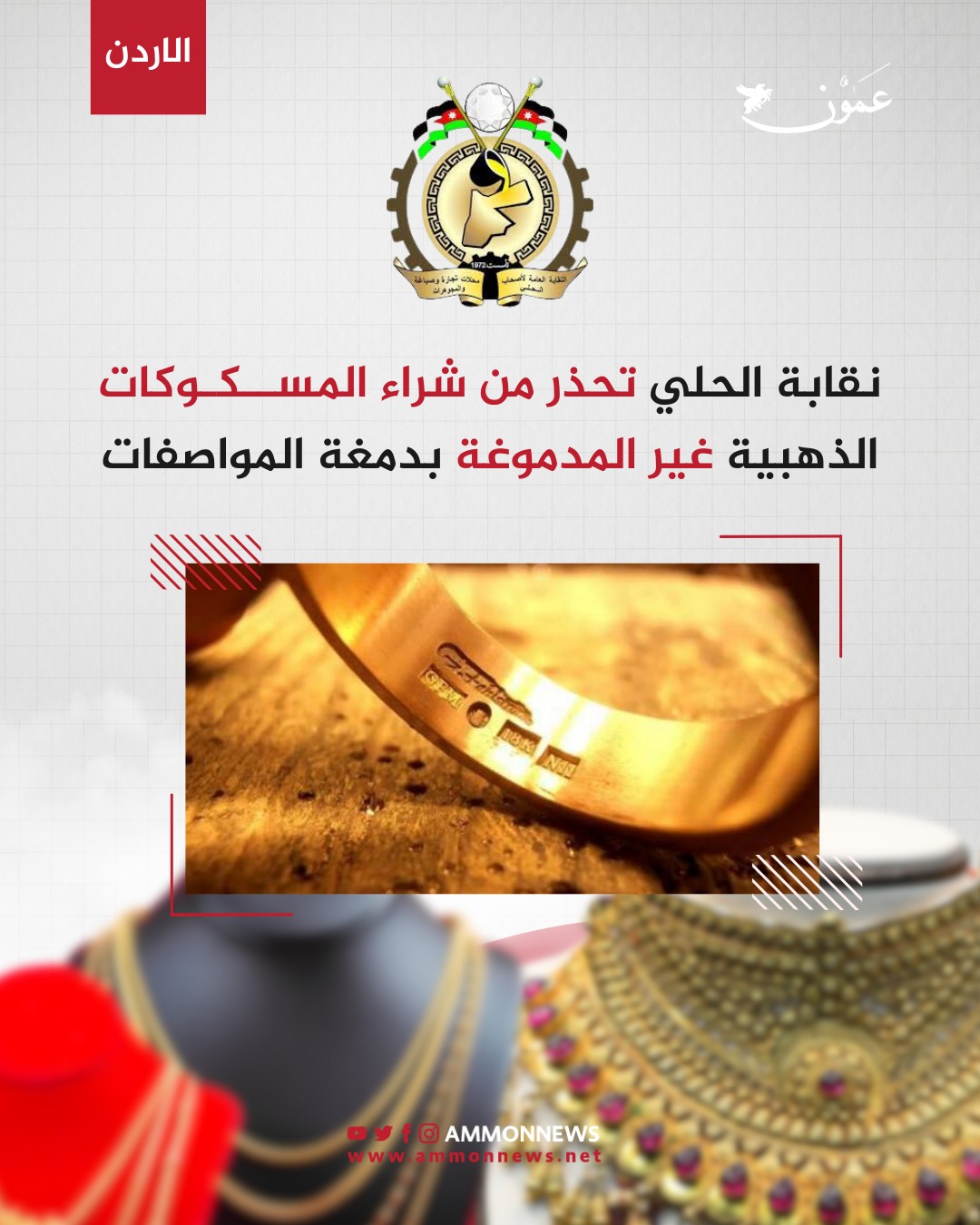 عمون - حذرت الهيئة الإدارية في نقابة أصحاب محلات تجارة وصياغة الحلي والمجوهرات المواطنين من شراء المسكوكات الذهبية بجميع فئاتها، سواء كانت ليرات إنجليزية أو رشادية أو أونصات ذهبية، من أي محل لا تحمل دمغة وزارة الصناعة والتجارة ممثلة بدائرة المواصفات والمقاييس، والمتمثلة بـ ختم الليزر الرسمي.