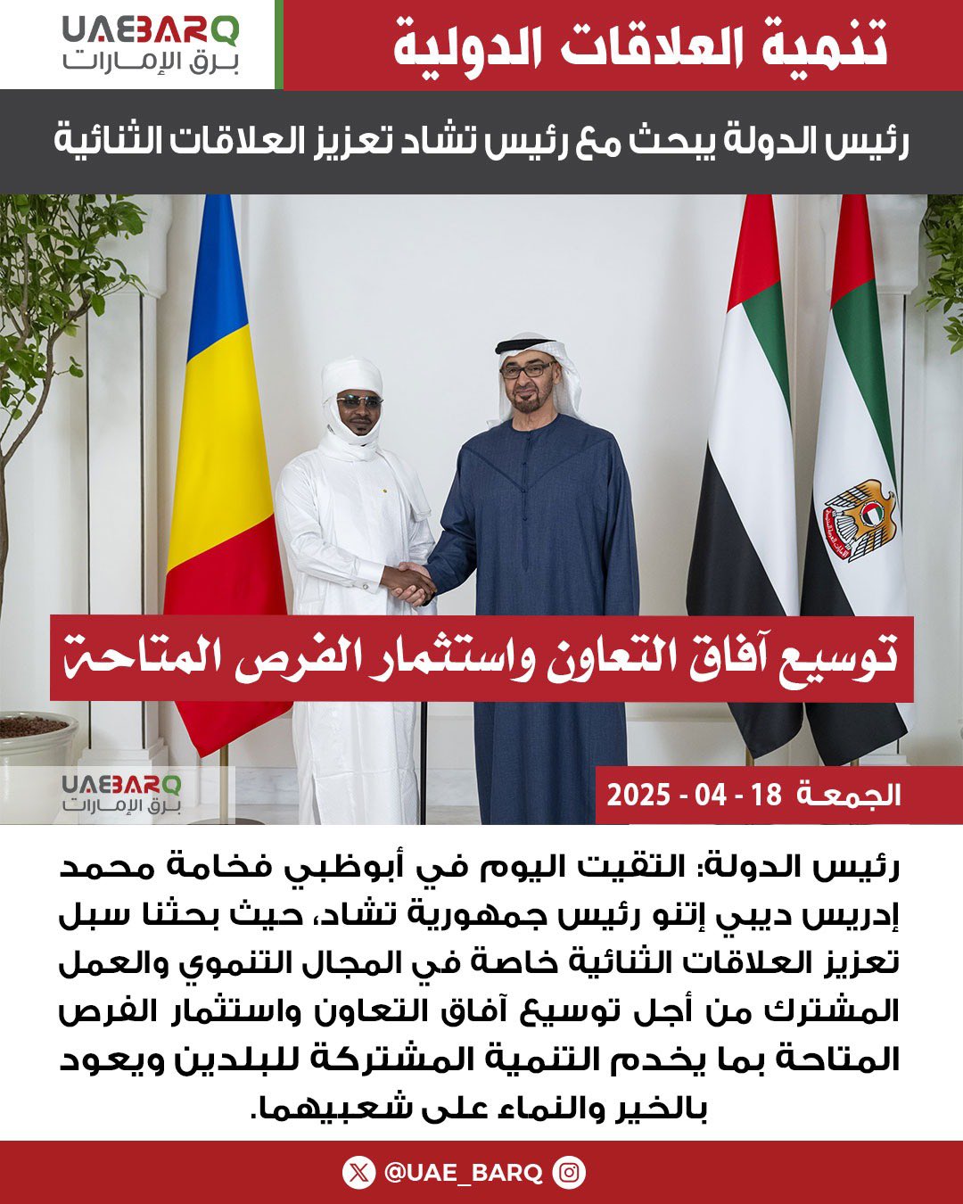 رئيس الدولة: التقيت اليوم في أبوظبي فخامة محمد إدريس ديبي إتنو رئيس جمهورية تشاد، حيث بحثنا سبل تعزيز العلاقات الثنائية خاصة في المجال التنموي والعمل المشترك من أجل توسيع آفاق التعاون واستثمار الفرص المتاحة بما يخدم التنمية المشتركة للبلدين ويعود بالخير والنماء على شعبيهما.