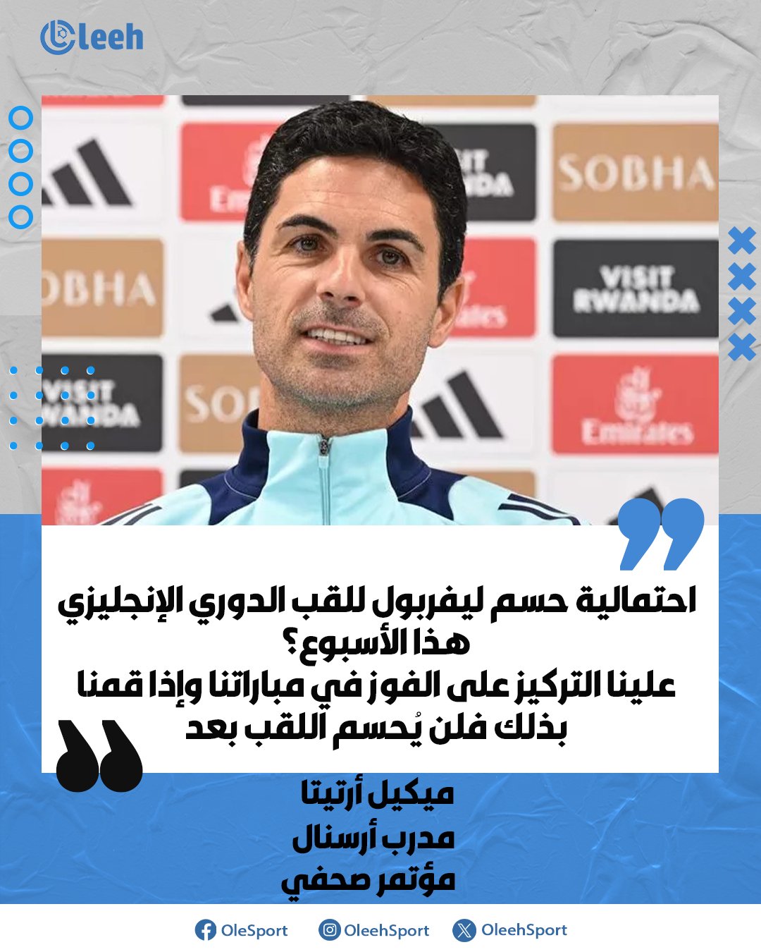 ميكيل ارتيتا من المؤتمر الصحفي عن احتمالية حسم ليفربول للقب الدوري هذا الأسبوع.. " الانتصار في اللقاء القادم سيؤجل حسم ليفربول للقب"