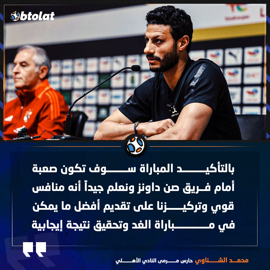 محمد الشناوي "خلال المؤتمر الصحفي ل مباراة صن داونز". المباراة سوف تكون صعبة وتركيزنا على تقديم أفضل ما يمكن في مباراة الغد وتحقيق نتيجة إيجابية