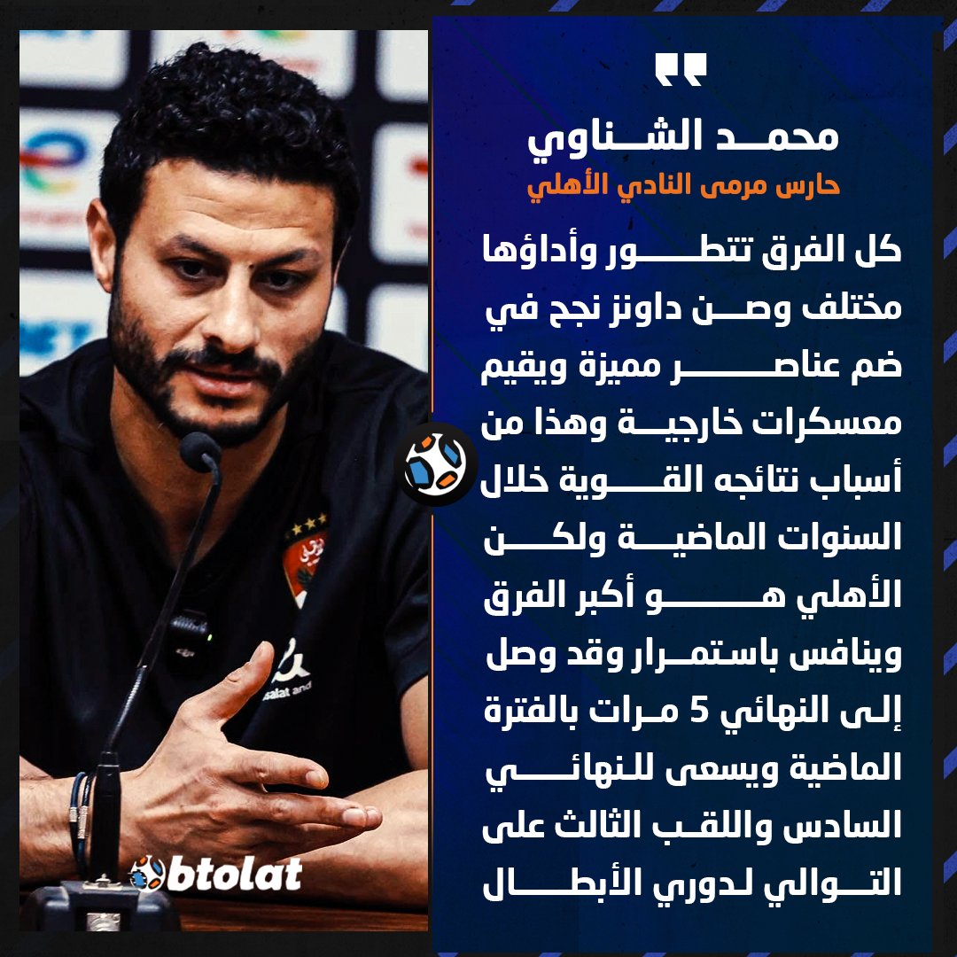 محمد الشناوي "خلال المؤتمر الصحفي ل مباراة صن داونز". الأهلي هو أكبر الفرق في إفريقيا وينافس باستمرار وقد وصل إلى النهائي 5 مرات بالفترة الماضية ويسعى للنهائي السادس واللقب الثالث على التوالي لدوري الأبطال