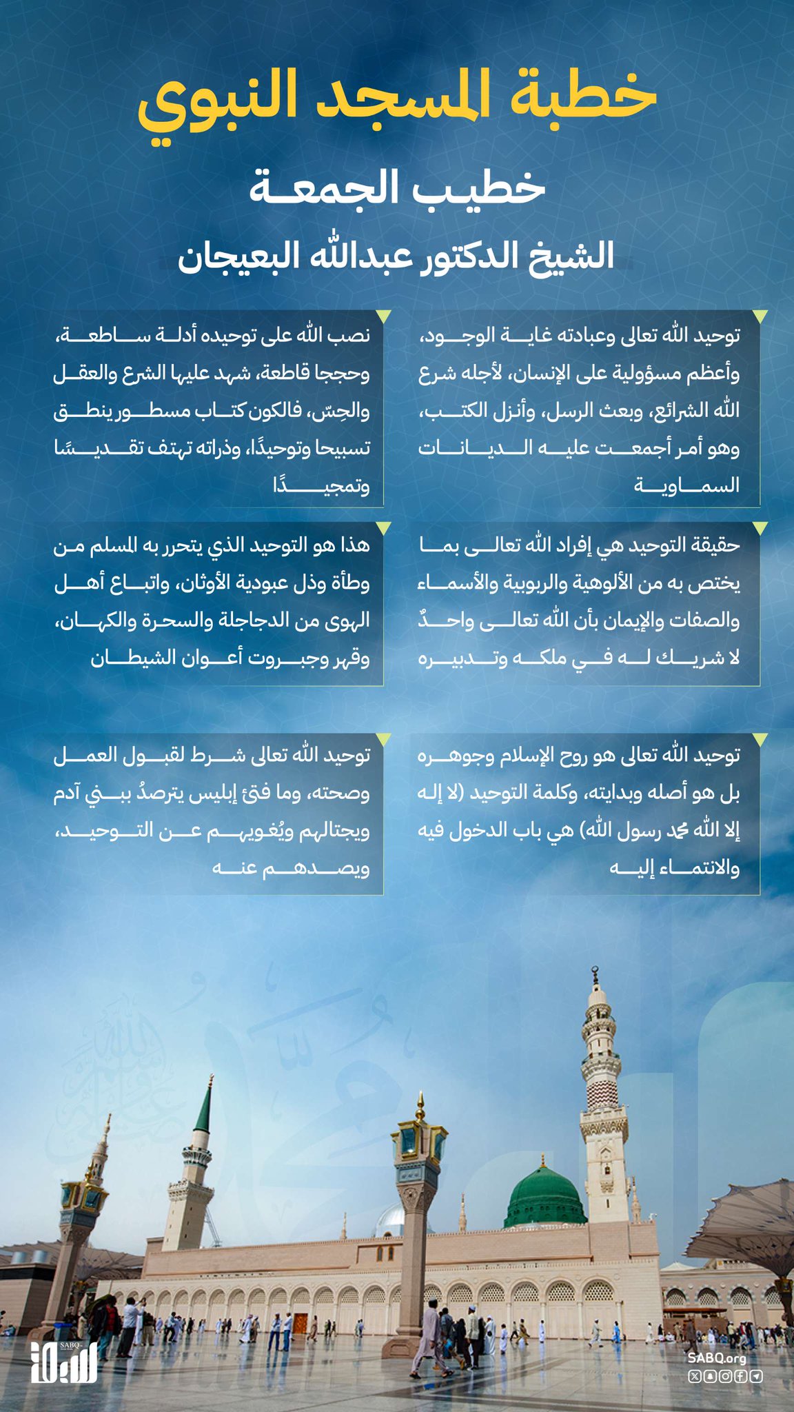 أوصى إمام وخطيب المسجد النبوي، الشيخ الدكتور عبدالله البعيجان، المسلمين بتقوى الله تعالى، والإقرار بربوبيته وتوحيده، مستشهدًا بقوله جل وعلا: (إِذْ أَخَذَ رَبُّكَ مِن بَنِي آدَمَ مِن ظُهُورِهِمْ ذُرِّيَّتَهُمْ وَأَشْهَدَهُمْ عَلَىٰ أَنفُسِهِمْ أَلَسْتُ بِرَبِّكُمْ ۖ قَالُوا بَلَىٰ ۛ شَهِدْنَا ۛ أَن تَقُولُوا يَوْمَ الْقِيَامَةِ إِنَّا كُنَّا عَنْ هَٰذَا غَافِلِينَ).