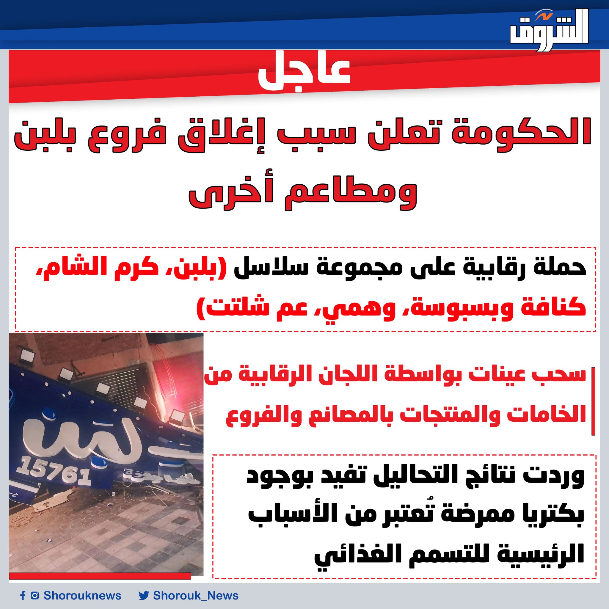 الحكومة تعلن سبب إغلاق فروع بلبن ومطاعم أخرى. حملة رقابية على مجموعة سلاسل (بلبن، كرم الشام، كنافة وبسبوسة، وهمي، عم شلتت). سحب عينات بواسطة اللجان الرقابية من الخامات والمنتجات بالمصانع والفروع. وردت نتائج التحاليل تفيد بوجود بكتريا ممرضة تُعتبر من الأسباب الرئيسية للتسمم الغذائي