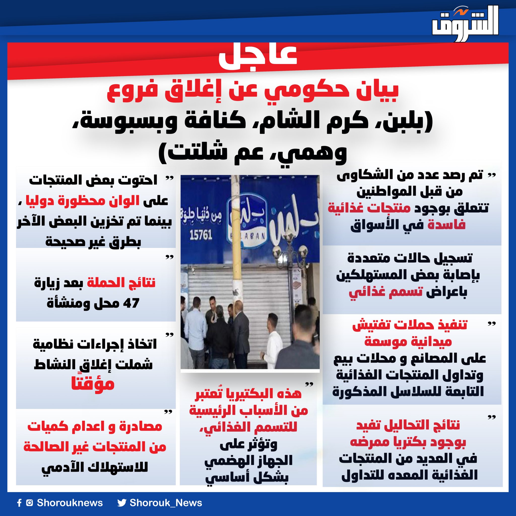 بيان حكومي عن إغلاق فروع (بلبن، كرم الشام، كنافة وبسبوسة، وهمي، عم شلتت)