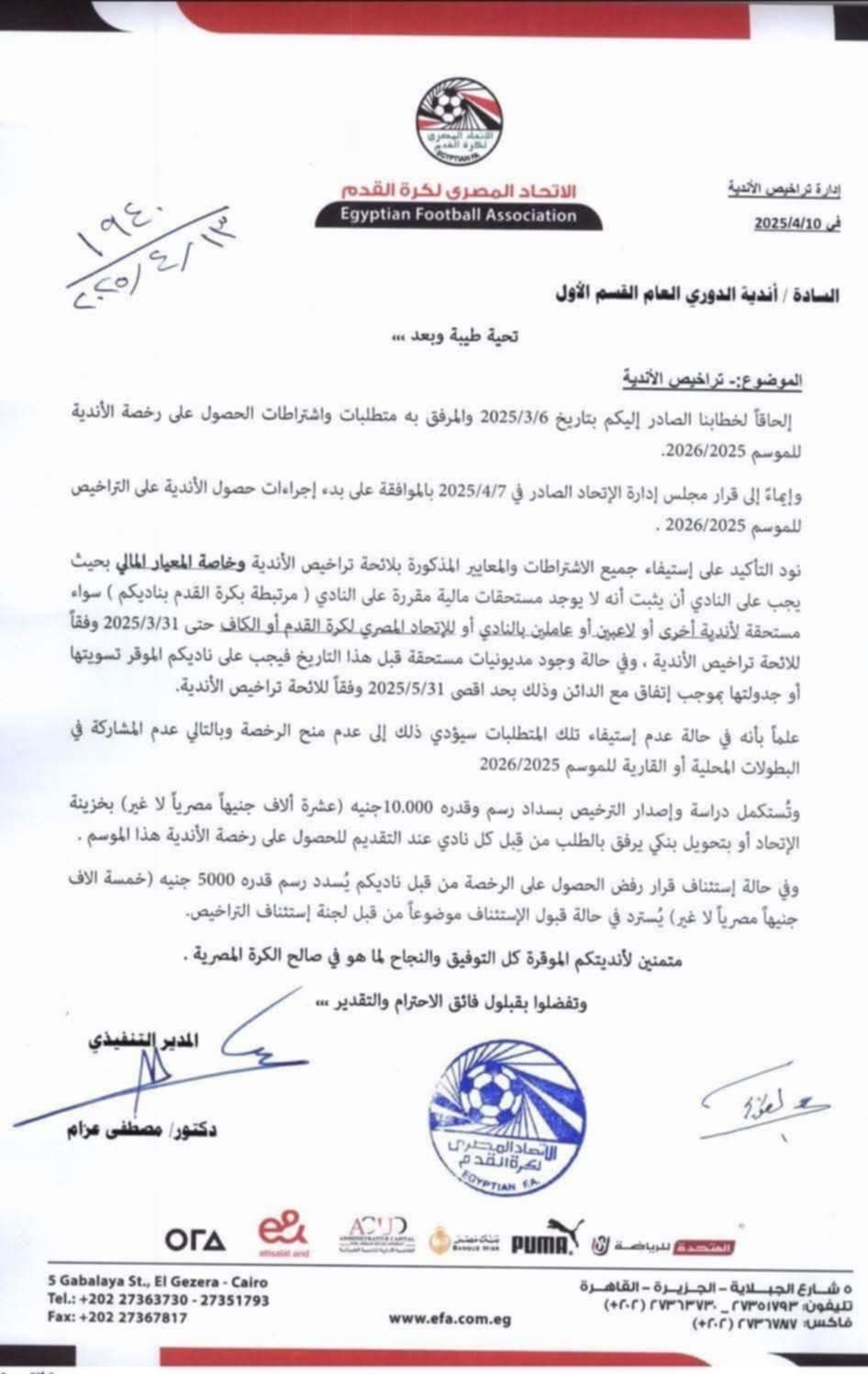 خطاب الاتحاد المصري لكرة القدم للأندية المصرية بخصوص تراخيص الأندية